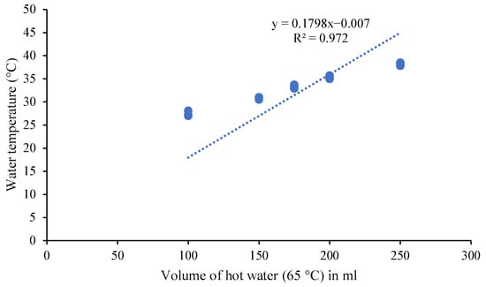 The temperatures of the irrigation water were determined with hot water (heated to 65 °C in a hot water bath, which was the maximum temperature of the water bath) and with running water from the tap (temperature of 17 °C). The water was then mixed with different amounts of water based on a preliminary test so that the ranges were maintained. The model for the water temperature mixture is shown in