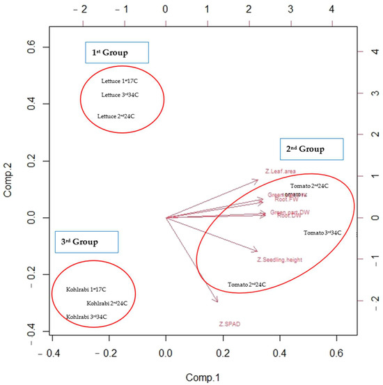 Figure 2). The first group included all three temperature treatments with lettuce. The variability of the data between the different irrigation temperatures for lettuce was low. Seedling height (seedling height) and relative chlorophyll content (SPAD) were low in lettuce. Lettuce exhibited an average green part and root FW or DW. The second group consisted of tomato treatments. The variability among the tomato treatments was greater than that observed for the other two vegetables. All analyzed parameters exhibited higher values in tomato seedlings compared to the other two vegetables. The third group consisted of kohlrabi treatments. As with lettuce, the variability was low.