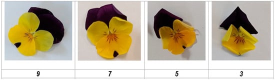 Visual quality scale of Viola cornuta “Penny Red Wing” flowers. A score of 9 represents fresh flowers without defects and with flat petals. A score of 7 indicates petals with slight signs of loss of freshness. A score of 5 denotes flowers with moderately curled petals, making the product no longer marketable. A score of 3 indicates fully curled petals and complete loss of freshness.