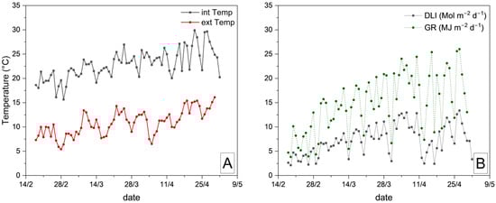 Daily average temperature trends inside and outside the greenhouse (A) and Daily Light Integral (DLI) radiation trends, provided by natural light only, measured in the greenhouse by sensors (mol m−2 d−1) and Global Radiation (GR) (MJ m−2 d−2) (B). Note that supplemental DLI from LED treatments is not shown here but described in the text.