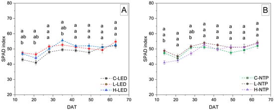 SPAD index (an indicator of chlorophyll content) of Viola cornuta leaves observed over days after transplanting (DAT) under different levels of supplemental LED light: C-LED (no additional light), L-LED (+75 μmol m−2 s−1), and H-LED (+150 μmol m−2 s−1) (A); and under different Non-Thermal Plasma (NTP) air treatments: C-NTP (no NTP treatment), L-NTP (low-NTP), and H-NTP (high-NTP) (B). Different letters indicate significant differences (p < 0.05) among treatments according to Tukey’s HSD test.