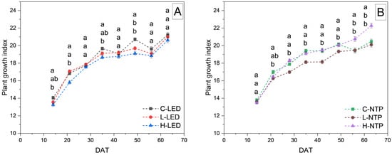 Plant growth index of Viola cornuta observed over days after transplanting (DAT) under different levels of supplemental LED light: C-LED (no additional light), L-LED (+75 μmol m−2 s−1), and H-LED (+150 μmol m−2 s−1) (A); and under different Non-Thermal Plasma (NTP) air treatments: C-NTP (no NTP treatment), L-NTP (low-NTP), and H-NTP (high-NTP) (B). Different letters indicate significant differences (p < 0.05) among treatments according to Tukey’s HSD test.