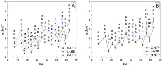 Viola cornuta flower yield observed over days after transplanting (DAT) under different levels of supplemental LED light: C-LED (no additional light), L-LED (+75 μmol m−2 s−1), and H-LED (+150 μmol m−2 s−1) (A); and under different Non-Thermal Plasma (NTP) air treatments: C-NTP (no NTP treatment), L-NTP (low-NTP), and H-NTP (high-NTP) (B). Different letters indicate significant differences (p < 0.05) among treatments according to Tukey’s HSD test.