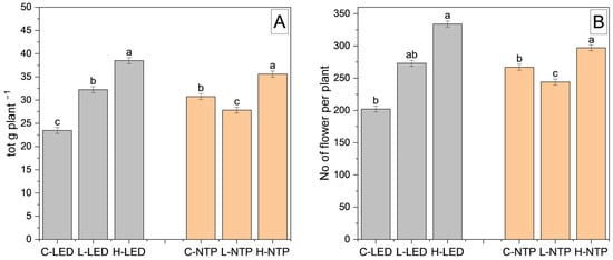 Viola cornuta total flower yield (g plant−1) and number of flowers per plant under different levels of supplemental LED light: C-LED (no additional light), L-LED (+75 μmol m−2 s−1), and H-LED (+150 μmol m−2 s−1) (A); and under different Non-Thermal Plasma (NTP) air treatments: C-NTP (no NTP treatment), L-NTP (low-NTP), and H-NTP (high-NTP) (B). Different letters indicate significant differences (p < 0.05) among treatments according to Tukey’s HSD test.