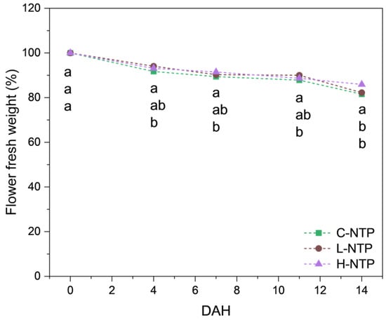 Fresh weight of flowers during the fifth shelf-life cycle observed over days after harvesting (DAH) under different levels of supplemental LED light: C-LED (no additional light), L-LED (+75 μmol m−2 s−1), and H-LED (+150 μmol m−2 s−1); and under different Non-Thermal Plasma (NTP) air treatments: C-NTP (no NTP treatment), L-NTP (low-NTP), and H-NTP (high-NTP). Different letters indicate significant differences (p < 0.05) among treatments according to Tukey’s HSD test.
