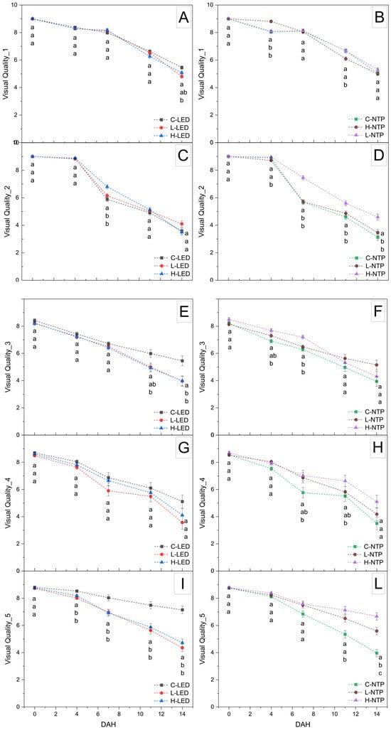 Visual quality of flowers during the first (A,B), second (C,D), third (E,F), fourth (G,H), and fifth (I,L) shelf-life cycle observed over days after harvesting (DAH) under different levels of supplemental LED light: C-LED (no additional light), L-LED (+75 μmol m−2 s−1), and H-LED (+150 μmol m−2 s−1); and under different Non-Thermal Plasma (NTP) air treatments: C-NTP (no NTP treatment), L-NTP (low-NTP), and H-NTP (high-NTP). Different letters indicate significant differences (p < 0.05) among treatments according to Tukey’s HSD test.
