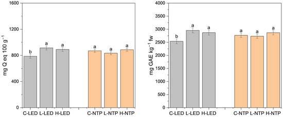 Concerning TFGC in flowers, values showed significant differences among the supplemental light treatments (Figure 9). Plants treated with L-LED supplemental light produced the highest values (914.4 mg Q eq 100 g−1 fw), followed by those treated with H-LED supplemental light (890.6 mg Q eq 100 g−1 fw), both significantly higher than the LED control (786.0 mg Q eq 100 g−1 fw). Non-Thermal Plasma air treatments did not show significant differences. Regarding TPC, flowers treated with L-LED and H-LED supplemental light produced the highest values (2958 and 2872 mg GAE kg−1 fw, respectively) compared to the LED control plants (2539 mg GAE kg−1 fw). In contrast, NTP air treatments did not show significant differences, even at different harvest times (Table S1).