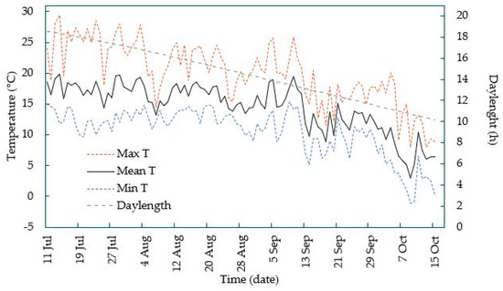 Daily maximum, minimum, and mean temperatures (°C) and daylength (h) during plant cultivation in the field at NIBIO Apelsvoll (60° 40′ N).