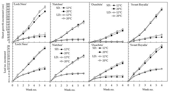 Time courses of cumulative shoot growth (above) and leaf number increment (below) in four blackberry cultivars during six weeks of cultivation at 12 and 20 °C and 10 and 20 h photoperiod as indicated. The data are the means ± SE of three replications, each with three plants of each cultivar.
