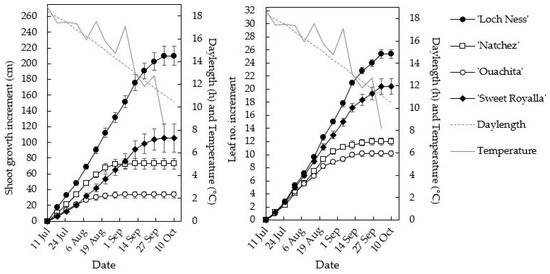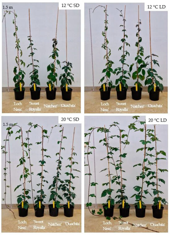 The plants used for the phytotron experiment were raised as described above throughout June and July. Then, on 3 August, when the plants had reached an average height of 84, 73, 48, and 62 cm and produced 14, 15, 14, and 17 leaves, respectively, for ‘Loch Ness’, ‘Natchez’, ‘Ouachita’, and ‘Sweet Royalla’, the plants were transferred to the daylight phytotron of the Norwegian University of Life Sciences at Ås, Norway (59°40′, 10°45′ E) and exposed to temperatures of 12 and 20 °C at photoperiods of 10 and 20 h for six weeks. To enable continuous plant growth without tipping, the plants were ‘trailed’ onto supporting sticks during the treatments.