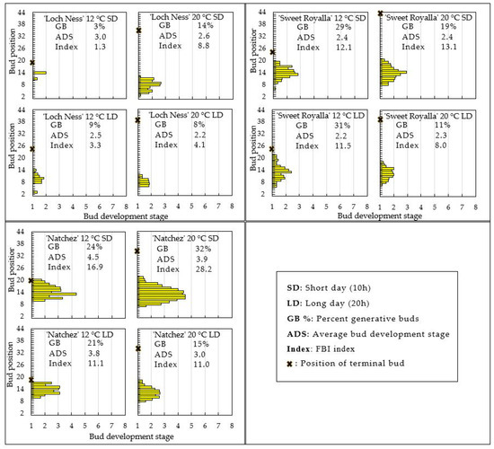The floral development of one plant of each cultivar from each of the three replications is presented in Figure 4, demonstrating that while ‘Ouachita’ had not initiated floral primordia at any of the tested conditions, the other three cultivars had visible floral primordia at various stages of development under all tested conditions after six weeks of cultivation. The FBI indices presented show that the most advanced flower buds were found in ‘Natchez’, which at both temperatures was also advanced by SD conditions. Next in order was ‘Sweet Royalla’, with no specific effects of temperature and photoperiod, and finally, ‘Loch Ness’, in which initiation was generally slow but slightly advanced by elevated temperature in SD. Common for the three cultivars was, however, that at 12 °C, the most advanced buds were located approximately 10 to14 nodes above the shoot base with generative buds occurring almost up to the apex, whereas at 20 °C, 15–20 non-flowering nodes were subtending the apical bud (Figure 4).