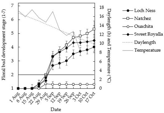 Initiation of flower buds was first observed in ‘Natchez’ on 1 September, followed by ‘Loch Ness’ and ‘Sweet Royalla’ one week later (Figure 6). ‘Natchez’ also reached the most advanced stages of flower development before the sampling was terminated after 15 weeks in mid-October. On the other hand, ‘Ouachita’ had not initiated any flower buds by that time.