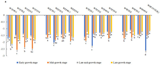 The alterations in the water potential of Pistacia weinmannifolia across distinct growth stages under identical watering conditions exhibit significant variations (p < 0.05), with divergent trends observed among treatments within corresponding growth phases. These differences are statistically significant (p < 0.05) (Figure 1a), suggesting variations in water potential across growth stages, with fertilization impacting plant water potentials. The water potential remains relatively stable during the initial stages of plant growth across treatments, with the lowest levels observed in the CK treatment, gradually increasing post-mid-growth phase. During the late growth phase, water potential levels were notably higher at W4 compared to W1, highlighting the influence of W on plant water potential. W emerged as a pivotal factor; however, minimal disparities were observed in water potential during later growth phases under W4 and W3 conditions. This suggests that at W3 levels, the plant water potential’s W requirement may have been adequately met, leading to diminished water competition among plants and a reduced impact of W on leaf water potential [22].