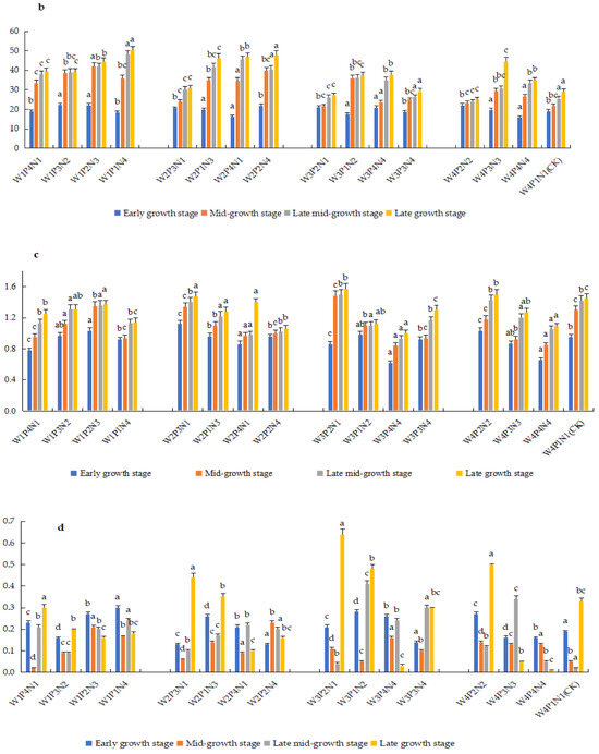 Subsequently, the overall chlorophyll content exhibited rapid augmentation following the initial growth stage, with significantly higher levels observed under the W1 and W2 treatments compared to those under the W3 and W4 treatments. When subjected to identical irrigation levels, the disparity in chlorophyll levels under varying fertilization conditions (p < 0.05) indicates that both irrigation volume and fertilization exert influence on chlorophyll content, highlighting that excessive irrigation does not facilitate chlorophyll enhancement (Figure 1b). Notably, chlorophyll levels surpassed those of the CK treatment during the late growth stage, with the most substantial increments observed in treatments W1P1N4 and W2P2N4, exhibiting levels 1.72 and 1.64 times higher than the control group, respectively, thereby suggesting a positive correlation between nitrogen content and chlorophyll enhancement.
