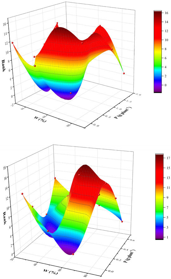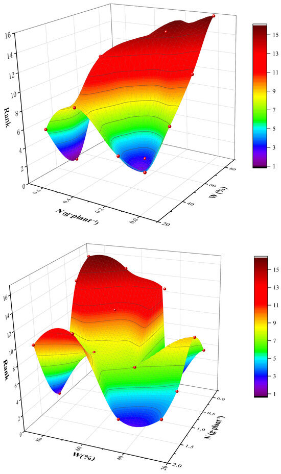 The interactive effects of W and P, W and N, and N and P on the comprehensive evaluation of photosynthetic parameters. Note: W, soil relative water content; P, pure phosphate fertilizer; N, pure nitrogen fertilizer; Rank; comprehensive evaluation rank of photosynthetic parameters.