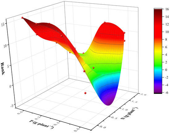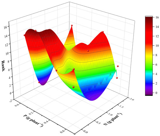 where Y represents the comprehensive score of the plant quality index, P denotes the application amount of pure phosphate fertilizer (g·plant−1), N denotes the application amount of pure N fertilizer (g·plantt−1), and W represents the soil relative water content.