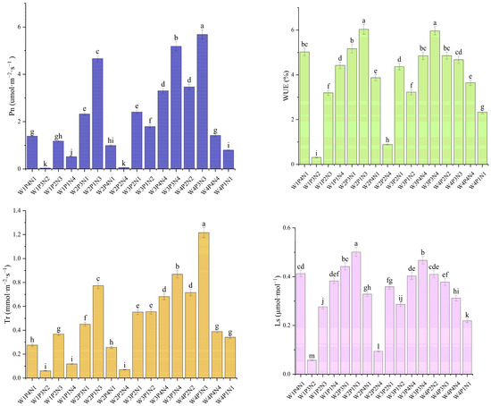 Various water and fertilizer regimes significantly affect Pn, WUE, Tr, Ls, Gs, Ci, and CE (p < 0.05) (Figure 3). Under specific irrigation and fertilization conditions, the Pn and WUE of Pistacia weinmannifolia leaves peaked under W4P3N3 and W2P1N3, respectively, compared to the control group W4P1N1 (CK), with increments of 610% and 158.59%, respectively. At the W1 level, both W1P4N1 and W1P2N3 exhibit higher values than the control group W4P1N1 (CK), suggesting that under water-deficient conditions, specific fertilization enhances photosynthetic efficiency. With the exception of W1P3N2 and W2P2N4 treatments, all other treatments exhibit higher values than the control group W4P1N1 (CK), suggesting that soil fertilization can enhance water use efficiency to some extent under low W conditions. The Tr value exceeds that of W4P1N1 (CK) when the W is low in W2P3N1 and W2P1N3 treatments, indicating that specific fertilization can augment Tr. Except for W1P3N2 and W2P2N4 treatments, the Ls value in other treatments surpasses that of W4P1N1 (CK). Particularly, in treatment W2P1N3, the elevated Pn value compared to W4P1N1 (CK) suggests that Ls imposes a lesser restriction on the photosynthetic rate of Pistacia weinmannifolia.