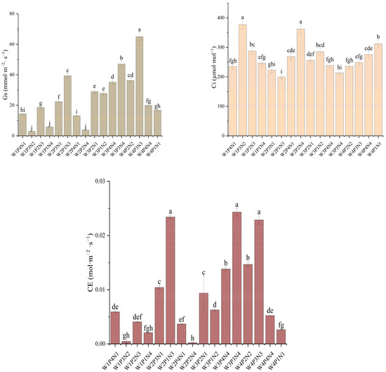 Gs values are uniformly low at the W1 level, with the lowest observed in the W1P3N2 treatment, indicating significant susceptibility to water stress. Ci reaches its peak in W1P3N2. Unlike Gs, Ci demonstrates lower susceptibility to water stress. Additionally, W1P3N2 exhibits the lowest Pn levels, which is indicative of water stress. The CE value is notably reduced in the W1P3N2 and W2P2N4 treatments, corresponding to the lowest Gs values. In treatments W2P3N1 and W2P1N3, the CE value significantly exceeds that of W4P1N1 (CK) (p < 0.05). In conditions with lower W levels, the CE of W2P1N3 did not decrease, suggesting that fertilization can enhance the plant’s carboxylation efficiency. At the W2 level, W2P1N3 exhibited a significantly higher carboxylation efficiency than W2P3N1, implying that increasing the P and N contents in fertilization can enhance carboxylation efficiency, with a more substantial effect achieved from increasing the N content than from increasing the P content. Conversely, when comparing W2P1N3 with W2P2N4, the CE did not increase despite the highest N content, suggesting that while a certain amount of N can enhance the plant’s carboxylation reaction, excessive N impairs the carboxylation process.