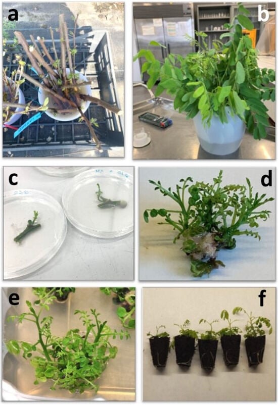 Sequence of steps in the micropropagation of Robinia pseudoacacia selected genotypes: (a) Large cuttings with dormant axillary buds, maintained in greenhouse at 20 °C. (b) Developed shoots used for the preparation of explants. (c) Initial development of the buds of R. pseudoacacia two weeks after planting. (d) Abundant callus formation caused by the highest concentrations of mT. (e) Excellent shoot proliferation following the liquid treatments with 0.025 mg/L AgNO3. (f) Rooted shoots from 120-cell trays ‘Riza Power’, which were pre-treated in NH4NO3-free MS medium.