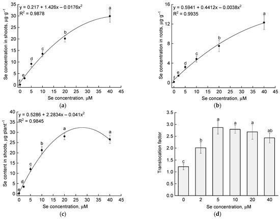Effect of selenium application on (a) Se concentration in shoots; (b) Se concentration in roots; (c) Se content in shoots; and (d) translocation factor. Different letters indicate significant differences between plants due to selenium concentration according to post hoc Tukey’s test (p ≤ 0.05; n = 4).