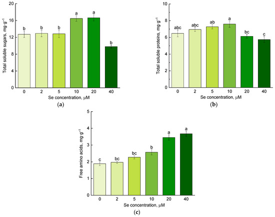 Effect of selenium application on content of (a) total soluble sugars; (b) total soluble proteins; and (c) free amino acids. Different letters indicate significant differences between plants due to selenium concentration according to post hoc Tukey’s test (p ≤ 0.05; n = 4).