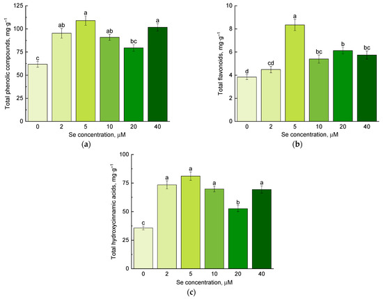 Effect of selenium application on contents of (a) total phenolic compounds; (b) total flavonoids; and (c) total hydroxycinnamic acids. Different letters indicate significant differences between plants due to selenium concentration according to post hoc Tukey’s test (p ≤ 0.05; n = 4).