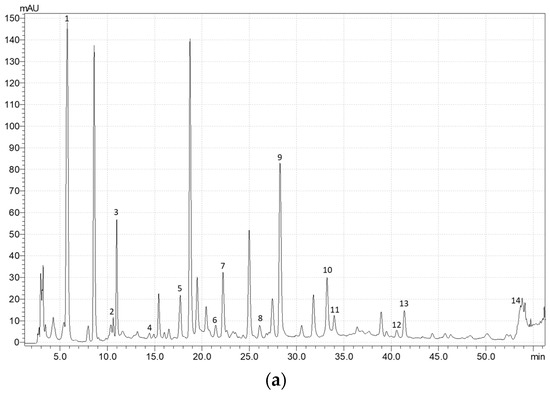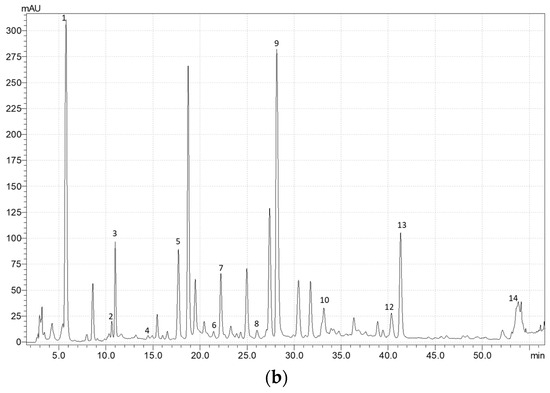 Exemplary HPLC chromatograms of the phenolic acids and flavonoids in oregano at 320 nm for (a) control plants (without selenium) and (b) plants treated with Se (5 µM). 1—3,4-dihydroxybenzoic acid; 2—catechin; 3—caffeic acid; 4—p-coumaric acid; 5—luteolin 7-glucoside derivative; 6—luteolin 7-glucoside; 7, 8—luteolin 7-glucoside derivatives; 9—rosmarinic acid; 10–14—luteolin 7-glucoside derivatives.
