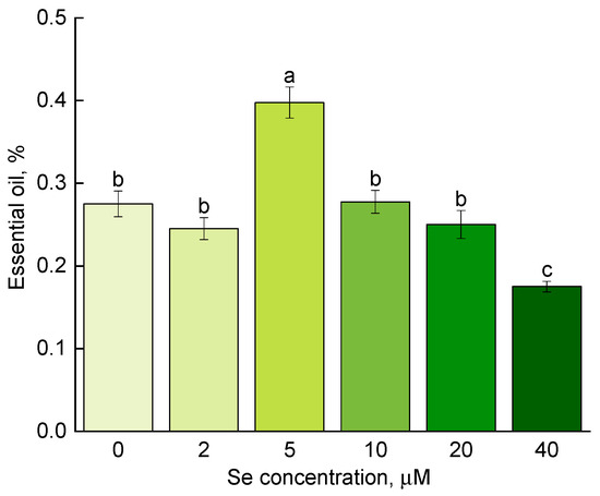 Effect of selenium application on content of essential oil in oregano. Different letters indicate significant differences between plants due to selenium concentration according to post hoc Tukey’s test (p ≤ 0.05; n = 4).