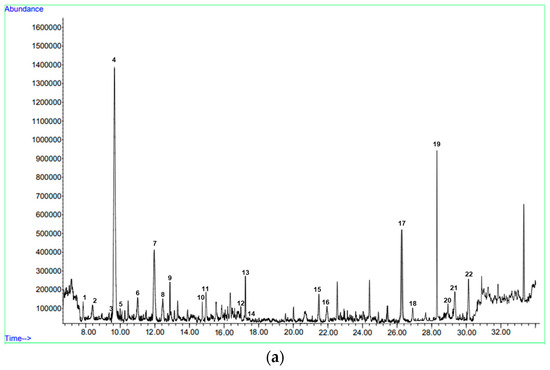 The composition of essential oil was analyzed by gas chromatography–mass spectrometry (GC-MS) (7890-B, Agilent Technologies, Santa Clara, CA, USA) equipped with a flame ionization detector (FID) and mass selective detector (MS) (5977A, Agilent Technologies, Santa Clara, CA, USA). Volatile components were separated with a capillary HP-5MS column (30 m × 250 μm and 0.25 µm film thicknesses) (Agilent Technologies, Santa Clara, CA, USA). Helium at a flow rate of 1.0 mL min−1 in a split ratio of 1:20 was used as a carrier gas. The oven temperature was set at 80 °C for 0 min, raised from 80 to 200 °C at 5 °C min−1, increased from 200 to 280 °C at 25 °C min−1, maintained at 280 °C for 5 min. The injector and detector temperatures were 250 and 300 °C, respectively, and the injection volume was 2 µL. The essential oil was diluted in hexane (1:300 v/v). Electron ionization mass spectra were recorded at a 70 eV electron energy. The essential oil components were identified on the basis of the comparison of their retention indices (RI) obtained with various n-alkanes (C9–C24) and of their mass spectra by using the NIST14 mass spectral library (National Institute of Standards and Technologies, Gaithersburg, MD, USA).