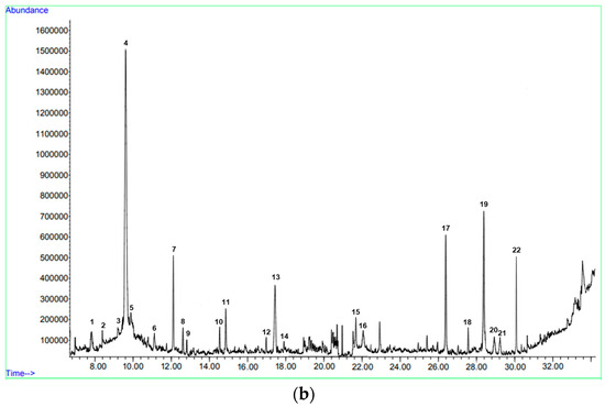 Exemplary TIC chromatograms of oregano essential oil for (a) control plants (without selenium) and (b) plants treated with Se (10 µM). 1—α-thujene; 2—α-pinene; 3—camphene; 4—sabinene; 5—β-pinene; 6—α-terpinene; 7—(Z)-β-ocimene; 8—(E)-β-ocimene; 9—γ-terpinene; 10—β-linalool; 11—trans-sabinene hydrate; 12—borneol; 13—terpinen-4-ol; 14—α-terpineol; 15—thymol; 16—carvacrol; 17—β-caryophyllene; 18—α-humulene; 19—germacrene D; 20—bicyclogermacrene; 21—β-bisabolene; 22—β-caryophyllene oxide.