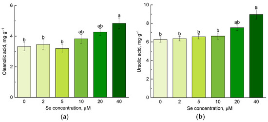 Effect of selenium application on content of (a) oleanolic acid and (b) ursolic acid. Different letters indicate significant differences between plants due to selenium concentration according to post hoc Tukey’s test (p ≤ 0.05; n = 4).
