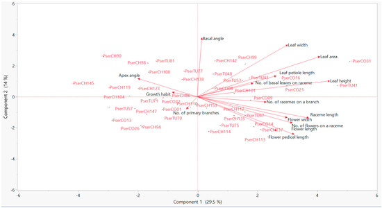 Figure 2. Principal component analyses for plant, leaf, and flower morphological characters of P. serotina subsp. capuli accessions grown at the University of Georgia Dempsey Farm, Griffin, GA, USA.