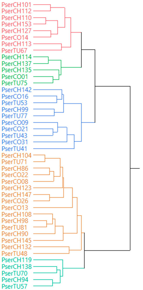 A dendrogram was made based on Ward’s minimum variance method using the studied morphological traits (Figure 3). The dendrogram classified the accessions according to the groups which are most similar. The accessions were differentiated into five main clusters (Figure 3). The first cluster included accessions, such as PserCH101, PserCH112, PserCO14, and PserTU67, which are associated with higher flower measurement values. The second cluster included accessions related to higher raceme measurement values such as PserCH114, PserCH137, PserCH135, PserCO01, and PserTU75. The third cluster includes accessions such as PserCO31, PserCO16, and PserTU41. This cluster was related with the accessions having higher values of leaf measurements and basal angle. The four and fifth cluster included accessions such as PserCH104, PserCH119, PserCO22, PserCO08, PserTU71, and PserTU81. They were clustered mainly based on variables like apex angle, growth habit, and number of primary branches. The clusters identified were not consistent with the provinces of origin for the accessions used in this study. The results from our study could be due to the self-incompatibility and outcrossing nature of these species. Rakonjac, Mratinić, Jovković, and Fotirić Akšić [24] also found similar results while studying morphological variability in wild cherry from Central Serbia.