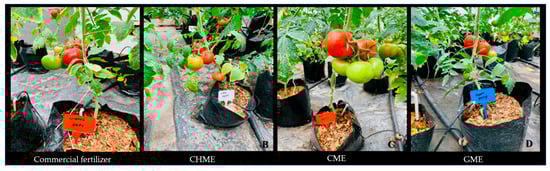 The treatments showed a significant effect on the colour index and firmness (0.014) of the tomatoes (Figure 2E,F). The colour index was significantly higher in plants fertigated with CHME and the commercial fertilizer (30.2 and 28.9, respectively). Additionally, firmness was significantly higher in GME (316.9 N), followed by CHME (253.1 N).