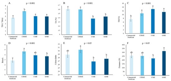 The treatments had a highly significant effect on the TSS, TA, TSS/TA and BrimA (Figure 2A–F). The TSS was significantly higher in CHME (6.47 °Brix) as compared to the other treatments. A similar trend was observed for the TA, where CHME and the commercial fertilizer had a significantly higher effect (0.62 and 0.61) than GME and CME (0.44 and 0.39).