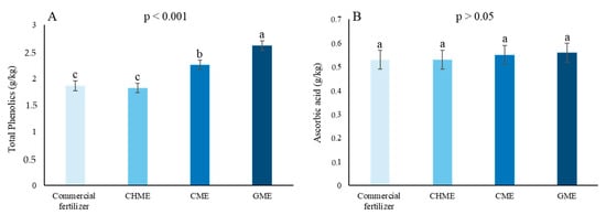 Effects of animal compost extracts and the commercial fertilizer on the phenolics (A) and ascorbic acid (B) of tomato fruit (cv. CLX 532) grown in soilless culture for 12 weeks. CHME—chicken manure extract; CME—cow manure extract; GME—goat manure extract. Values are the means ± SE (n = 4). Different lower-case letters within the graph indicate significant differences among different treatments at LSD (p < 0.05).