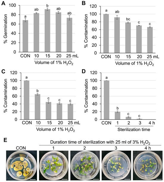 Pathogen-free in vitro seedling preparation from Cheungsam seeds. (A) Enhanced germination rates of Cheungsam seeds germinated in different volumes of 1% H2O2. (B) Reduced contamination rates of seedlings germinated in different volumes of 1% H2O2. Contamination rates were assessed 2 weeks after transferring the sterilized seedlings to MS medium. (C) Reduced contamination rates of seedlings additionally sterilized with different volumes of 1% H2O2 after removing the seed coat. (D) Reduced contamination rates of seedlings with removed seed coat, additionally sterilized with 3% H2O2 for different durations (1, 2, 3, and 4 h). (E) Representative images of seedlings with removed seed coat sterilized with 3% H2O2 for different durations (1, 2, 3, and 4 h). Pictures were taken 2 weeks after transferring the sterilized seedlings to MS medium. CON: water control (Scale bar in all panels = 2 cm). Different letters above the bars indicate a statistically significant difference at p < 0.05 according to the Tukey HSD test.