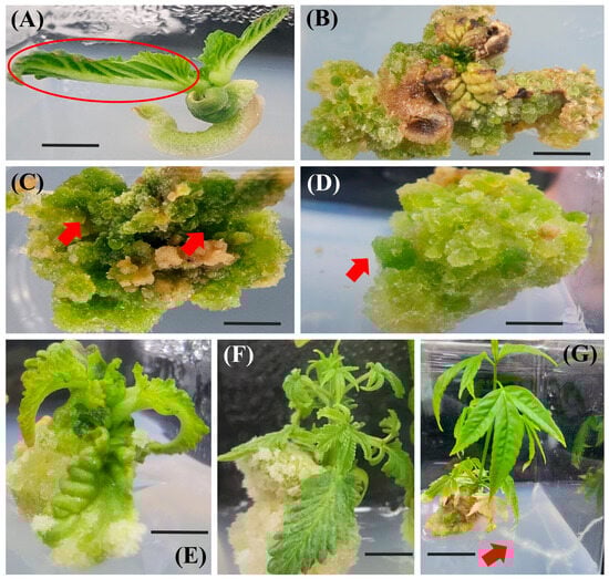 Callus formation and de novo organogenesis of the excised leaf of Cheungsam plants. (A) Pathogen-free seedlings germinated in H2O2 solution as a liquid germination medium and grown on MS medium. Red circle: Leaf tissue used for callus formation. Scale bar = 0.2 cm. (B–D) Callus induced from leaf explants. Scale bar = 0.2 cm. Initial swelling and formation of callus from leaf explants (4-week-old, (B)). Green nodular photosynthetic and friable callus (red arrows, 5-week-old, (C)). The initial stage of shoot regeneration from photosynthetic callus (red arrow, 6-week-old). (D). Scale bar = 0.2 cm. (E,F) De Novo shoot morphogenesis from leaf-induced callus on shoot induction medium (SIM) containing 0.5 mg/L TDZ. Scale bar = 0.2 cm. (G) De Novo root morphogenesis from leaf-induced callus on root induction medium (RIM) containing 2.5 mg/L IBA. Scale bar = 1 cm. Regenerated roots are indicated by the red arrow.