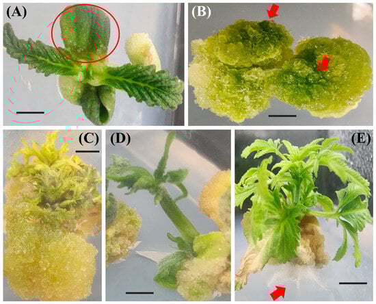 Callus formation and de novo organogenesis of excised cotyledon tissues from Cheungsam plants. (A) Pathogen-free seedlings germinated in H2O2 solution as a liquid germination medium and grown on MS medium. Red circle: Cotyledon tissue used for callus formation. Scale bar = 0.2 cm. (B) Callus induced from the cotyledon explants 7 days after incubation on CIM. Initial swelling and formation of callus from cotyledon explant. Green nodular photosynthetic and friable calli are indicated by red arrows. Scale bar = 0.2 cm. (C,D). De Novo shoot morphogenesis from cotyledon-induced callus on SIM containing 0.5 mg/L TDZ. Scale bar = 0.2 cm. (E) De Novo root morphogenesis from cotyledon-induced callus on RIM containing 2.5 mg/L IBA. Regenerated roots are indicated by the red arrow. Scale bar = 1 cm.