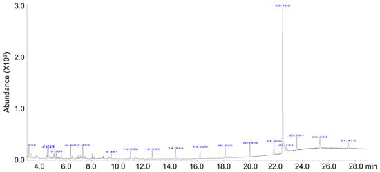 A GC/MSD system (5977A Series, Agilent Technologies, Santa Clara, CA, USA) and DB-5 ms columns (Agilent Technologies, Santa Clara, CA, USA) were used for the GC–MS analysis. The oven temperature was held at 80 °C for 1 min and then increased to 240 °C at a rate of 10 °C·min−1, from 240 °C to 260 °C at a rate of 5 °C·min−1, and from 260 °C to 300 °C at a rate of 20 °C·min−1, and was finally held at 300 °C for 10 min. The injector and mass interface temperature was 300 °C. Helium was used as a carrier gas at a flow rate of 1 mL ·min−1. The injection mode was split, and the scanned mass range was from 40 to 450 m/z. Two µL of each sample was injected for the analysis. The result was analyzed using the National Institute of Standards and Technology version 11 (NIST 11 spectral library).
