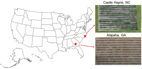 Study Locations and Description of the Blueberry Bushes. Images were collected initially at the UGA Alapaha research farm, Alapaha, GA (31.3852° N, 83.2229° W, Figure 1). The blueberry breeding population at this location consists of 91 SHB breeding lines from 27 independent crossing families, selected based on the adaptability of the local growing environment and fruit quality. The advanced selections were clonally propagated by softwood cuttings and transplanted in 2018 and 2019. To generalize the model, another set of images was collected at Horticultural Crop Research Station Ideal Field located in Castle Hayne, NC (34.3648° N, 77.8387° W). A mechanical harvest trial of advanced SHB breeding selections was planted in 10–11 plant plots 1 m apart with 3 m row centers in October–November of 2019 and 2020.