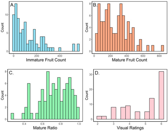 Histogram showing distributions of (A) immature fruit count, (B) mature fruit count, (C) mature ratio predicted from the model, and (D) visual ratings of mature ratio on a 1 to 6 scale in a blueberry population consisting of 91 breeding lines in Alapaha, GA, 2023.
