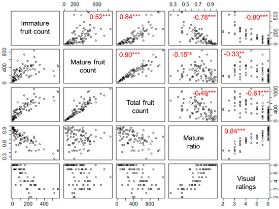 Pearson correlation among immature fruit count, mature fruit count, total fruit count, mature ratio detected by the model and visual ratings of mature ratio in a blueberry mapping population in Alapaha, GA, 2023. **, and *** indicate significance at 0.05, 0.01, and 0.001 P level.