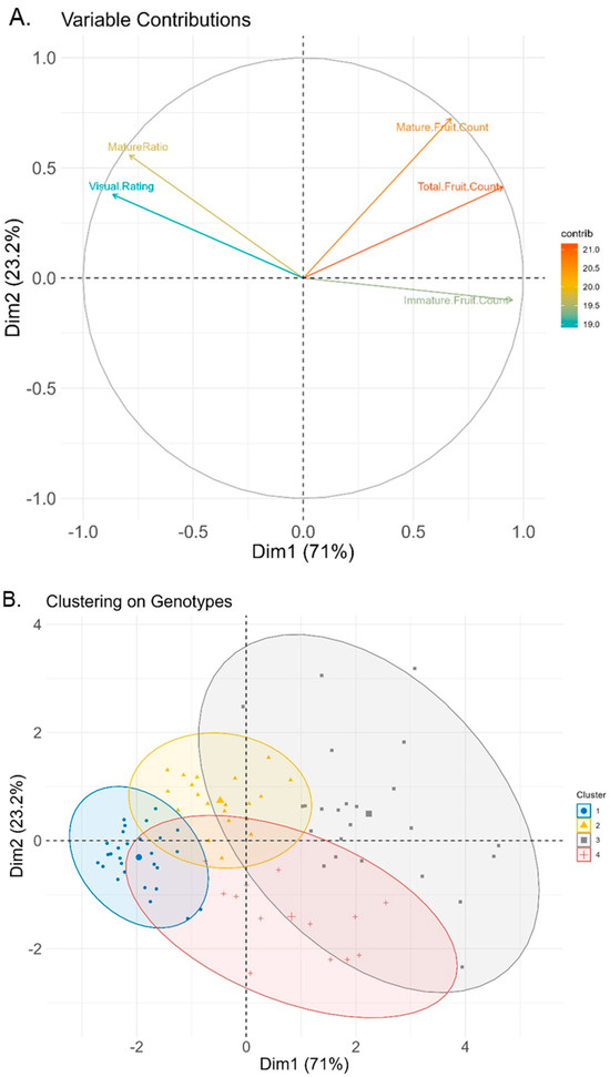 Principal component analysis (PCA) showing (A) variable contributions for berry count, mature ratio, and visual ratings of maturity and (B) cluster results based on the PCA analysis.