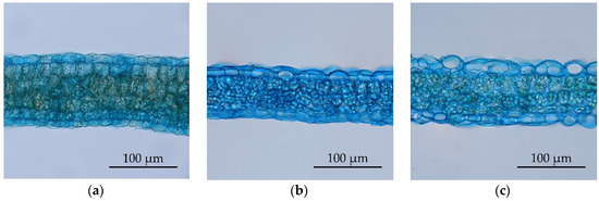 | Palisade mesophyll thickness (µm) | 47.1 ± 1.1 a | 19.1 ± 0.3 c | 24.9 ± 0.2 b |
