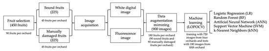 As shown in Figure 2, the dataset, consisting of 900 images of green bell peppers, was obtained from the fluorescence image acquisition system only due to unreliable accuracy of below 0.4 by using white digital images. A data augmentation method using mirroring was applied to increase the number of samples in the original dataset, improving the model’s generalization capability and avoiding overfitting [25]. Each image was mirrored on the vertical axis, obtaining 900 images as the total number of samples, including the original images. We utilized a pixel-based approach for our analysis. Specifically, we collected a total of 900 data points of fruits. These points were hand-selected or labeled, with 450 corresponding to pixels where incisions were made on the peppers (damage regions) and 450 randomly selected from healthy peppers (non-damage regions). This balanced selection aimed to ensure that our model was trained on both damaged and undamaged pixels, allowing it to effectively learn the differences between these regions. To assess the robustness of our model across different orchards, we employed a leave-one-population-out cross-validation (LOPOCV) approach. In this method, each orchard data is treated as an independent ‘population’. Our dataset comprises 900 fruit samples, with equal samples from each of the five orchards.