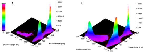 Excitation and emission matrix of sound (A) and damaged (B) green bell pepper. Scale bar from 0 to 3000 corresponding to fluorescence intensity is expressed in arbitrary units, AU.