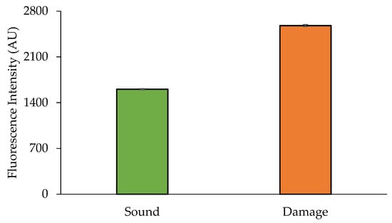 Bar plot showing the mean fluorescence intensity (arbitrary units, AU) at Ex/Em 380/689 nm for sound and damaged green bell pepper samples. Error bars represent the standard deviation (SD) of fluorescence intensity measurements, with n = 5 biological replicates per sample type.