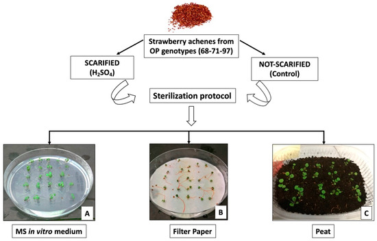 The use of in vitro growing media for strawberry seed germination has also been evaluated by some researchers as a valuable option for more standard substrates. Miller and collaborators [24] increased the germination rate up to 100% and decreased the germination delay by longitudinal cutting of achenes on Murashige and Skoog (MS) medium free of plant growth regulators (PGRs). This technique was particularly efficient from the point of view of germination rate but much too laborious for the cutting of the achenes.