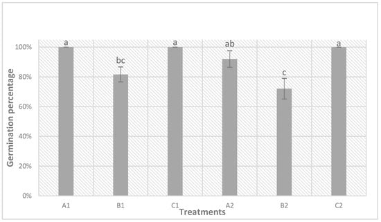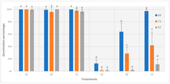 The scarification protocol was carried out on seeds of three different populations of Fragaria × ananassa advanced breeding selections (68, 71, 97), which were then sterilized before being placed to germinate on the different germination media (GM): (A) MS in vitro medium; (B) Whatman® filter paper; (C) peat. Results in terms of germination efficiency and speed of the germination of scarified seeds were compared with those of not-scarified (but only sterilized) seeds (controls) sown on the different GM. For each genotype and condition, germination efficiency was tested by six replicates of 25 seeds each (150 seeds in total). In general, a significant difference was observed between the scarified (condition n. 1) and not-scarified seeds (condition n. 2) for all genotypes, regardless of the GM used (Figure 2). A germination rate of above 95% was observed for all scarified seeds regardless of the breeding population and GM used. Meanwhile, concerning the not-scarified seeds, statistically significant differences were observed. In particular, the breeding population 68 (blue histograms in Figure 2) showed the best germination efficiency in all GM, with the highest rate being obtained when seeds were sowed on GM-C2 (97%) (similar to the germination efficiency observed for scarified seeds), followed by GM-B2 (64%) and GM-A2 (13%). The breeding population 97 showed the lowest germination rate in all three GM when seeds were not scarified. In general, the GM that induced the lowest germination rate for not-scarified seeds in all three genotypes was A2 (MS in vitro medium), which led to 13% germinated seeds for the genotype 68 and 1% for the other two genotypes (71 and 97).